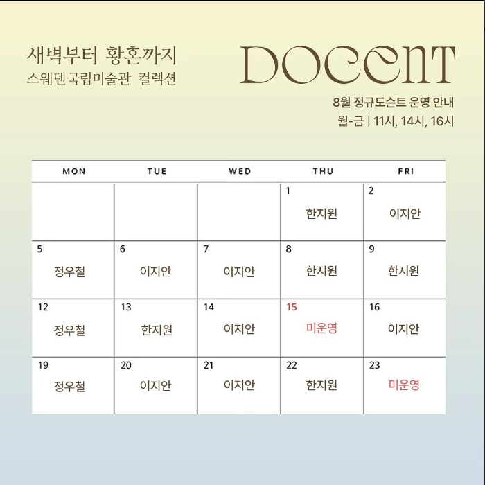 정규 도슨트 프로그램 정보 : 월-금 11시, 14시, 16시 (1일 3회)