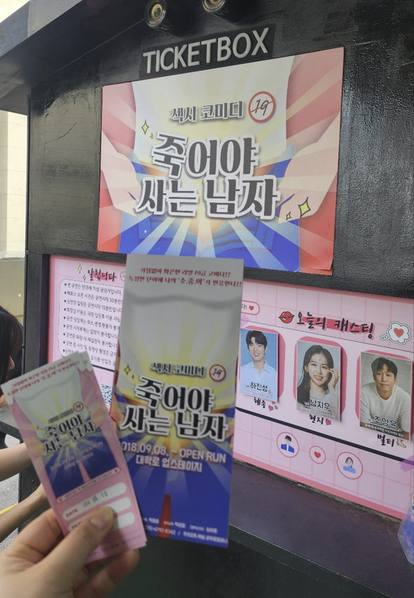 19금에 <죽어야 사는 남자> 제목이 음... ㅎㅎㅎㅎ 뭔가 민망하고, 이걸 누구랑 보러 가나? 싶으실 수 있어요?! 사실 제가 그런 생각을 했었거든요? (대체 무슨 생각을...) 대학로 지나다니면서 포스터를 보고 저거 봐도 되는 건가? 싶기도 했거든요 ㅎㅎ 에이~ 그래도 볼 수 있는 공연을 하겠지! 아무리 19금이어도 말이야~~ 하면서 보게 됐어요~