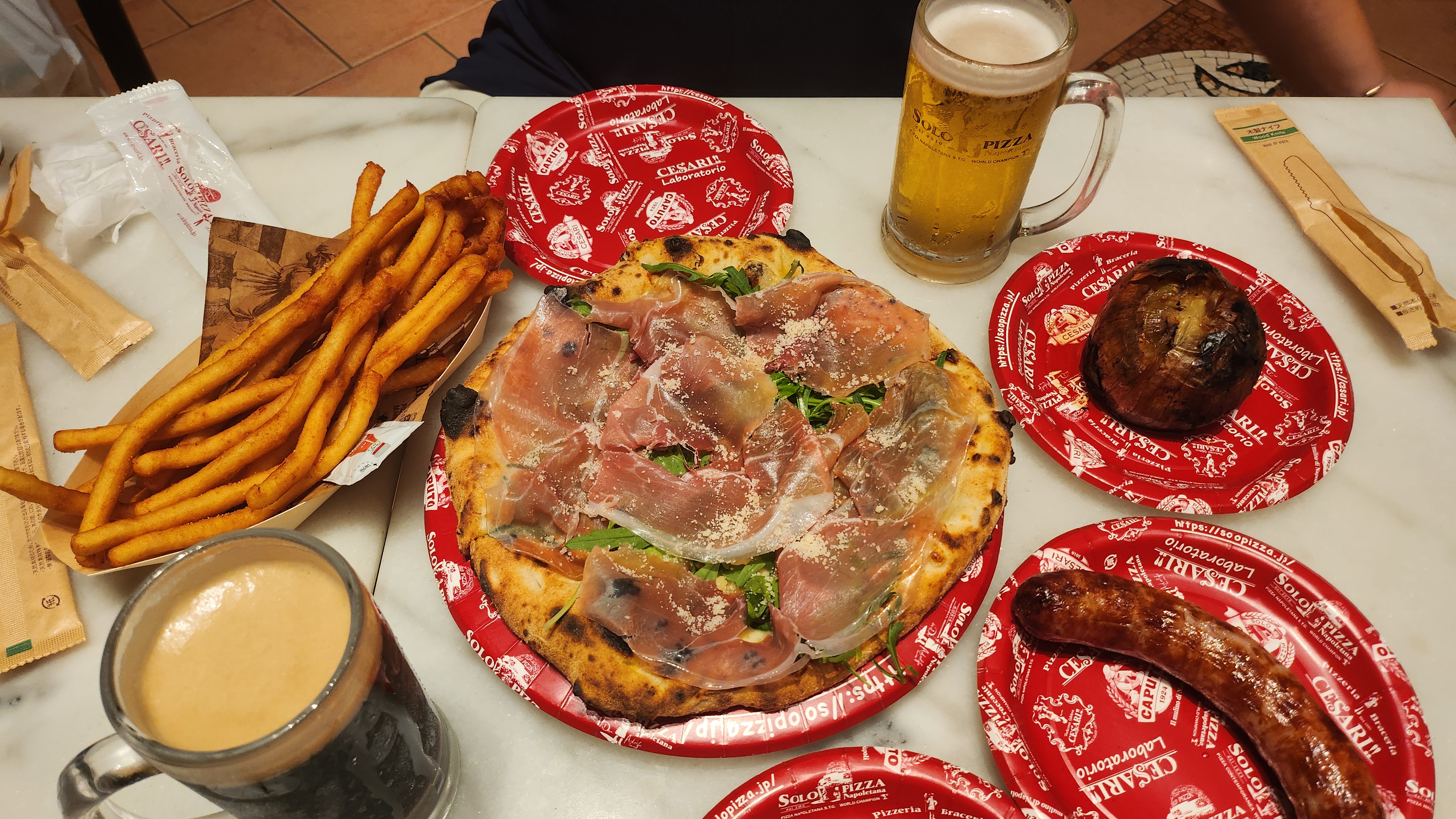 저는 프로슈토 들어간 게 먹고 싶어서 프로슈토 루꼴라 피자와 초리소 소시지, 양파구이, 감자튀김, 맥주를 시켰어요.