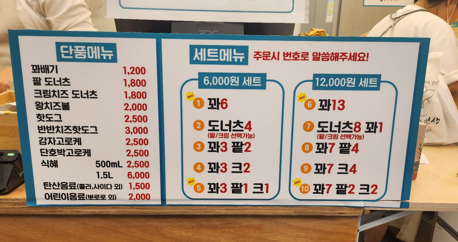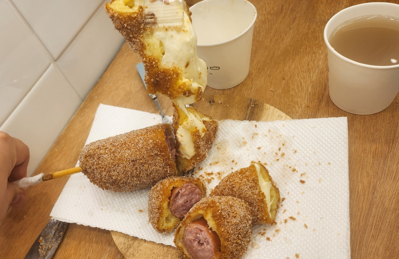 감자 고로케, 호박 고로케, 왕치즈볼, 핫도그, 식혜 하나씩 시켰어요